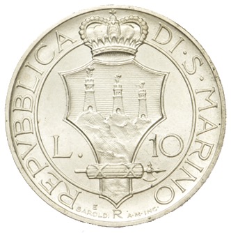 10 Lire 1932 D/stemma araldico di San Marino con le tre torri piumate R/ rappresentazione di Sant'Agata vista di fronte in alto a destra circolarmente PROVA Pagani PP 576 Luppino PP 348