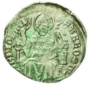 Grosso D/Scudo inquartato con aquila e la biscia, sopra corona da cui escono due rami R/Il Santo mitrato e nimbato, seduto, tiene nella dx lo staffile e nella sx il pastorale. CNI104 e seguenti