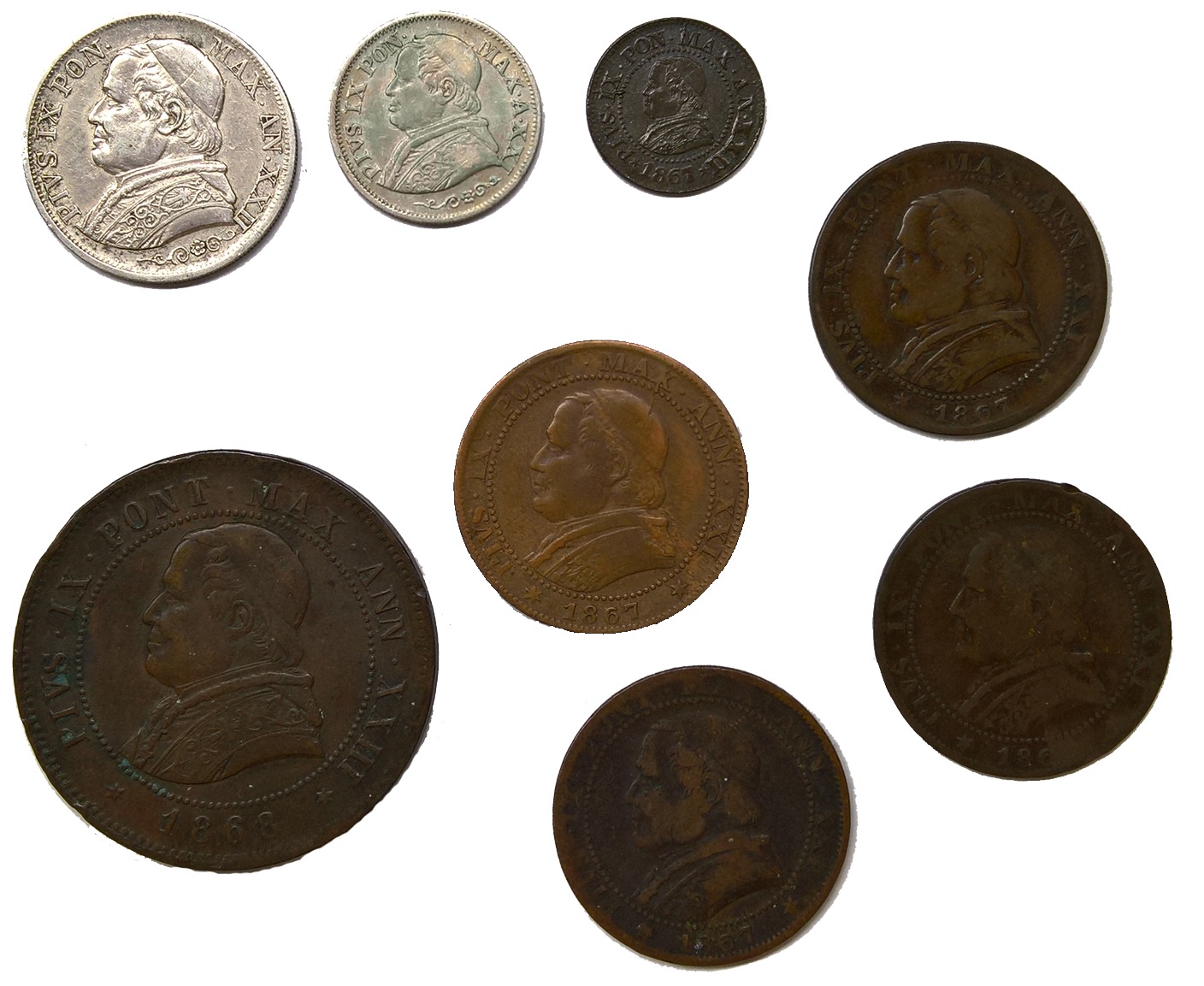 Lotto composto da 6 monete (2 argento e 4 bronzo) Stato Pontificio Pio IX: 2 da 1 centesimo; da 1 soldo ; 4 soldi;