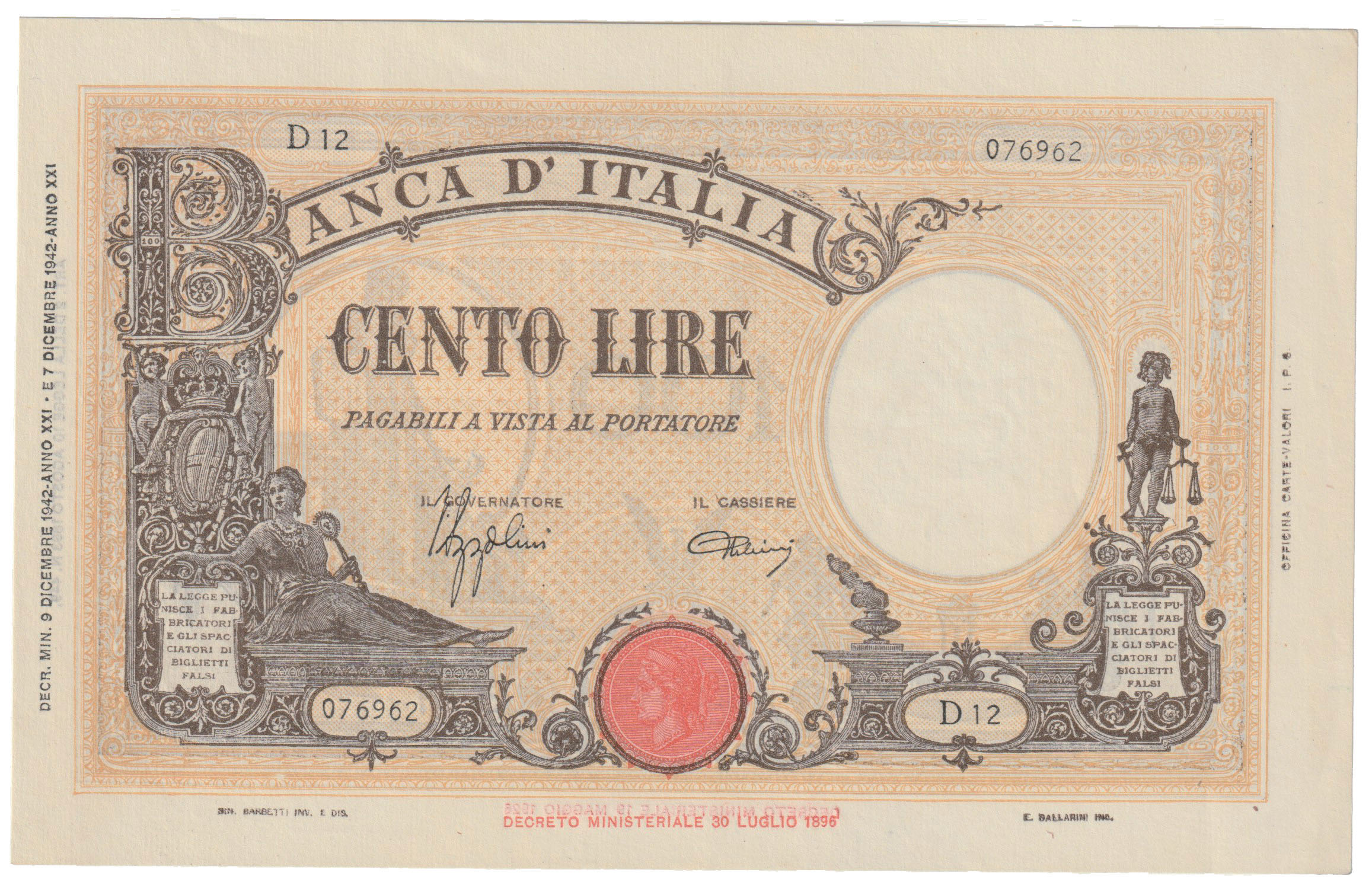 Banca d'Italia 100 lire 09.12.1942 . Certificato Vendemia 10.03.2016 n. 5056/II